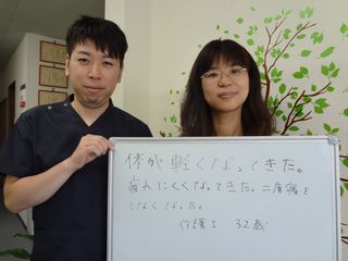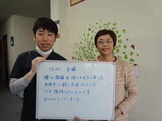 最初ここへ来る前は右脚が動かなかった。おもらしもしてしまう事があった。2回目からは右脚が軽くなり、痛みもなくなり動くようになり、片付け、草むしりが出来る様になり良かったです。打ては全く使用しなくなりました。