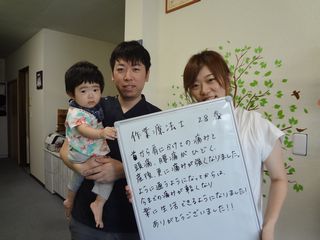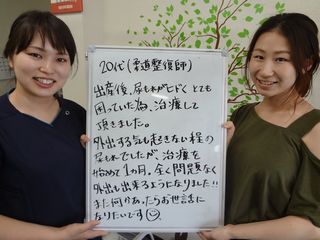 今日で3回目の治療でした。それまでは足の付け根と腰に痛みがありましたが、今では全くなくなりました。妊娠10ヶ月ですが、お腹も張ることもなく、元気に動いたいます。針の痛みも気になりません。